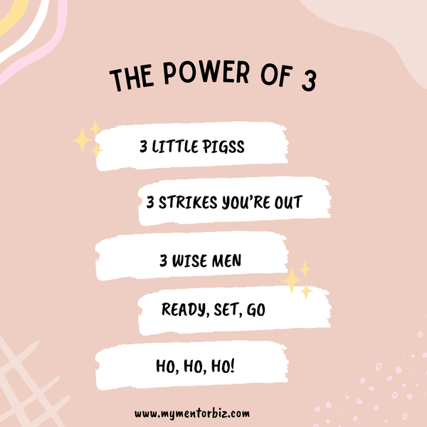 The Power of 3 is the most basic pattern which helps us solve problems, but it also helps us remember important messages. It helps us be more eloquent when we have conversations and it’s one of my go-to formula’s when I’m getting to know