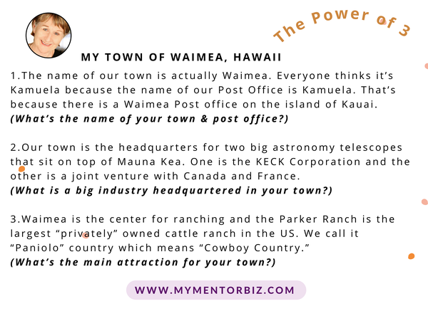 So, I’ll share 3 things about where I live that I think are pretty interesting and to get you familiar in using the Power of 3, I’d like you to reply to this email and
